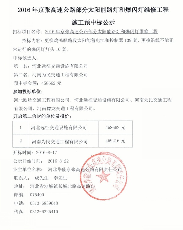 2016年京張高速部分太陽能路燈和爆閃燈維修工程施工預(yù)中標公示